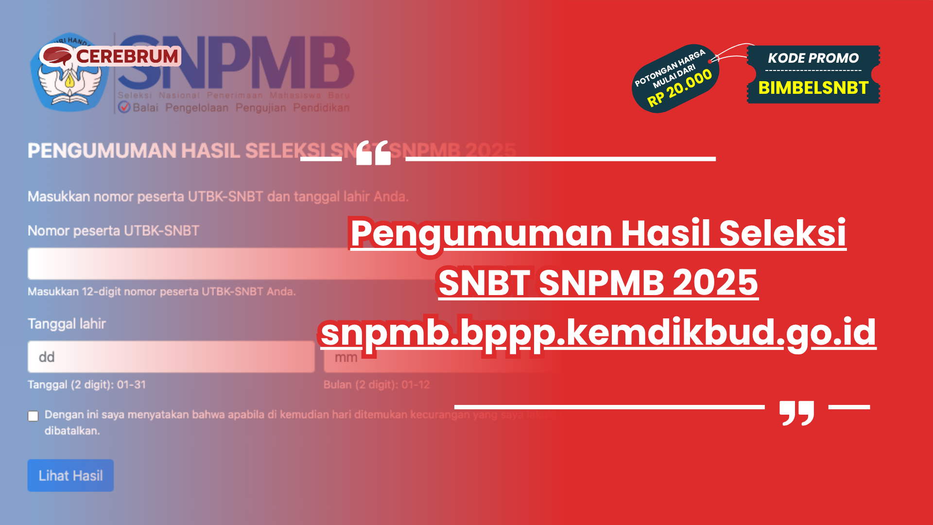 Peserta dapat melihat hasil seleksi SNBT melalui laman resmi https://snpmb.bppp.kemdikbud.go.id menggunakan nomor peserta dan tanggal lahir. Portal pengumuman dibuka mulai pukul 15.00 WIB sesuai jadwal resmi yang ditetapkan oleh SNPMB.